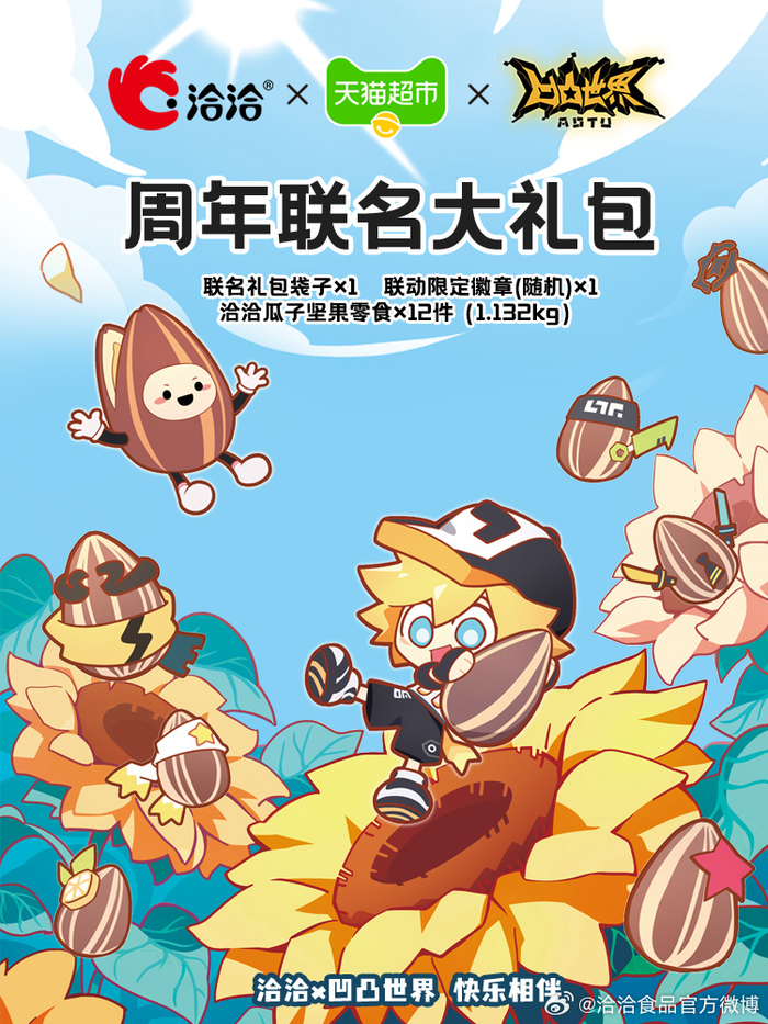 动画番剧和电影IP也持续参与零食的联名。例如,盐津铺子在开年联动了上美影经典动画《大闹天宫》,以齐天大圣的金箍棒为形象切入点,推出联名“麻辣棒”;随着《欢迎来到我身边》电影上映,7月,良品铺子推出了影片同款可牛鸭薯片以及明星演员定制周边,引发粉丝抢购;今年,恰逢洽洽食品25周年以及《凹凸世界》8周年,二者趁热打铁,携手推出了“周年联名大礼包”,“一起过生日”的玩法吸引了动画IP粉丝以及食品消费者双方的眼球。