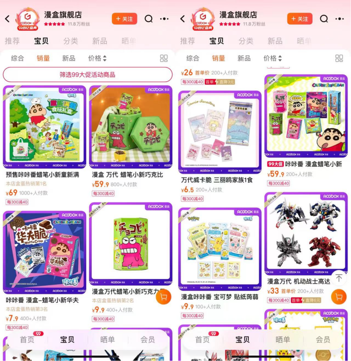 根据今年6月的最新消息,食玩品牌ACGBOX漫盒于近日完成数千万元A轮融资,本轮融资由Ventech China独家投资,棕榈资本担任独家财务顾问。据介绍,ACGBOX漫盒2017年在上海成立,定位于食玩赛道,曾经获得CPE源峰和摩点投资。将动漫IP融入休闲零食,漫盒在2023年同比取得了近3倍业绩的增长。在淘宝漫盒旗舰店内,蜡笔小新IP的食玩礼盒成为店内热销第一名,此外,三丽鸥威卡脆食玩收藏卡、宝可梦贴纸果冻等也在持续热销。