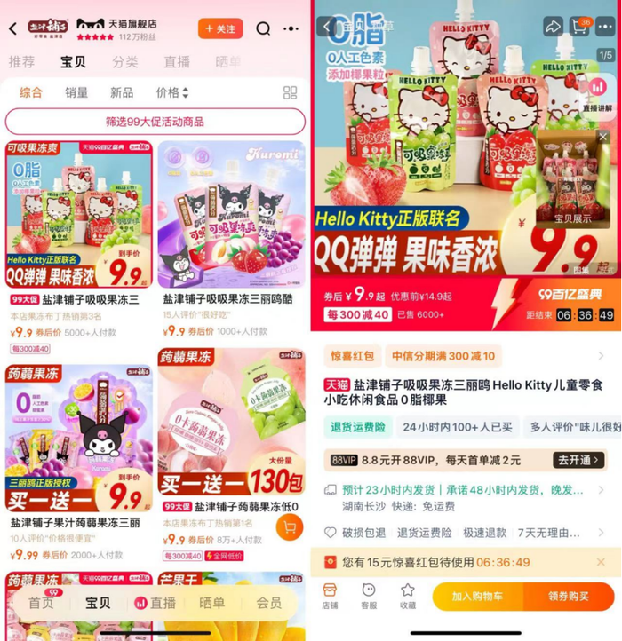 今年,盐津铺子也发力IP联名,旗下“蒟蒻满分”品牌联名了大热IP三丽鸥,三丽鸥乐园主题果冻持续推出“酷洛米联名款可吸果冻爽”、“大耳狗联名款可吸酸奶味果冻”等新品,成为年轻消费人群热捧的夏季零食爆款。在盐津铺子食品旗舰店中,综合排名前三的均为三丽鸥联名吸吸果冻产品,单品销量超过6000+。