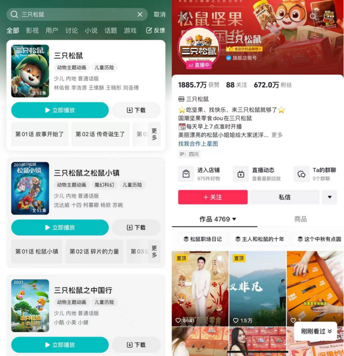 一直以来,该公司都在以IP化的方式打造品牌,通过IP衍生周边、动画片、短视频等多元业态扩大产品影响力。据悉,其目前已衍生出《三只松鼠》、《三只松鼠之中国行》《三只松鼠之松鼠小镇》、《三只松鼠之松鼠小镇2》、《小鹿蓝蓝》等系列动画片,同时还在持续输出新的内容,不断赋予品牌新的生命力。其中,动画片网络播放量累计超35亿次,覆盖超4亿观众,电视台播映期间,收视率多次位列央视少儿、卫视第一。