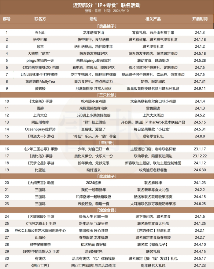 一定程度上可以看出,“IP+零食”的玩法,让这些上市休闲食品公司不管从产品销售还是品牌营销方面都得到了可观助力。那么,零食巨头们更钟爱哪类IP?雷报统计了近期部分“IP+零食”联名活动。